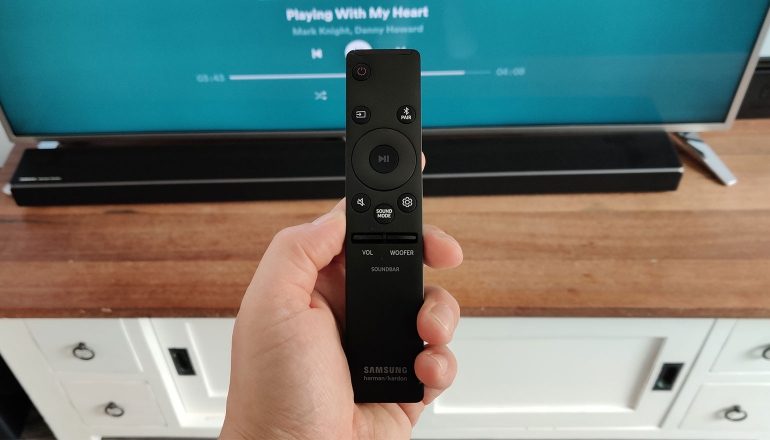 Soundbars staan bekend om hun gemak en in het geval van de Samsung Q70R is dat ook niet anders. Na het aansluiten kun je heel vlot aan de slag. Wanneer de tv wordt ingeschakeld, dan gaat ook de soundbar aan. Die kun je vervolgens bedienen met je tv-afstandsbediening of de meegeleverde remote. Die laatste biedt meer functies aan en stelt je in staat het geluid aan te passen en van geluidsmodi te wisselen. De knoppen op de afstandsbediening zijn even wennen, maar we zijn met name te spreken over de volumebediening.