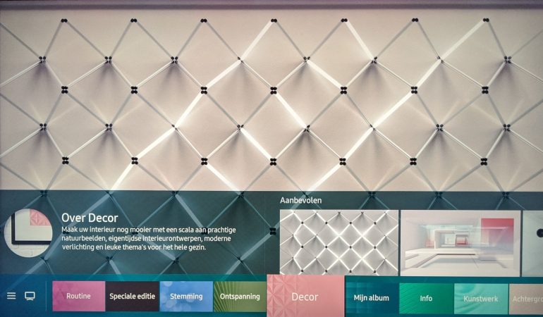 Met Ambient Mode heeft Samsung ook een leukte troef in huis om de tv een functie te geven als je niet actief tv kijkt. Kies een leuk patroon, een kunstwerk, of je eigen foto’s en de tv wordt zo een deel van je interieur.