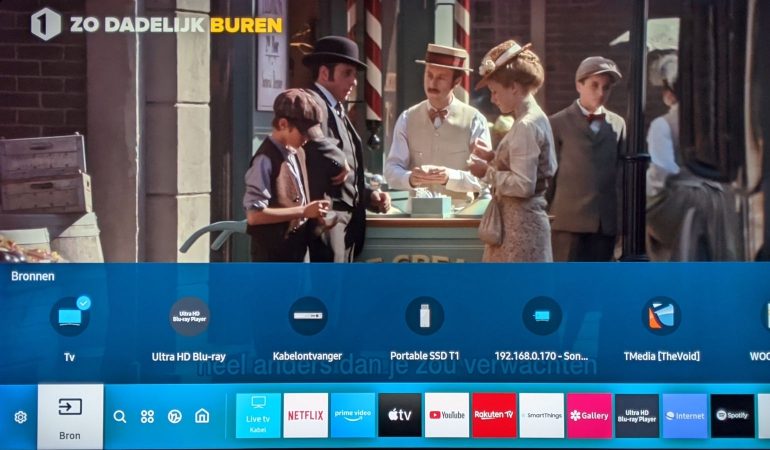 Onze enige klacht: wie nog steeds de gewoonte heeft om zendernummers in te toetsen, moet dat doen met een “on screen” nummerblok, want op de afstandsbediening zelf staan geen nummertoetsen. Er zijn sneltoetsen voor Netflix, Amazon Prime Video en Rakuten tv (Movies). Je kunt de afstandsbediening configureren om er aangesloten apparaten mee te bedienen. Selecteer het lint met alle bronnen, en kies helemaal rechts “Instellen universele afstandsbediening”.