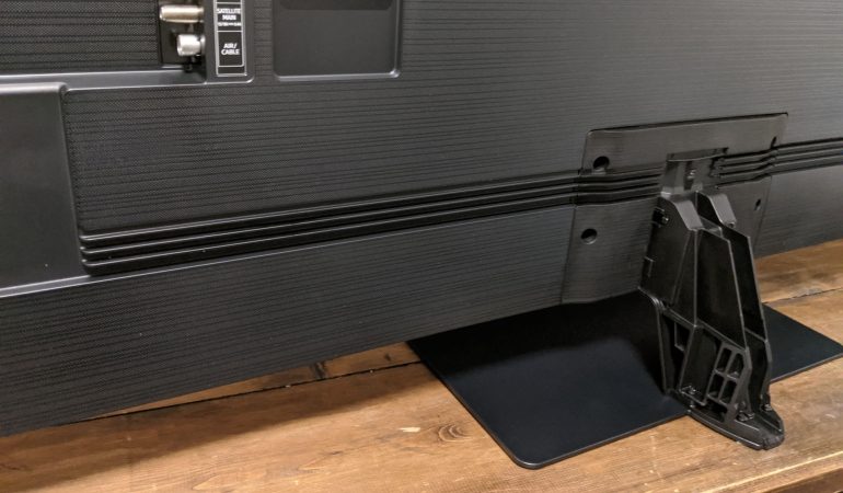 Het toestel staat op een stevige centrale voet. De voetplaat is maar 39 cm breed, zodat het toestel ook op minder brede meubels past. Alhoewel de montage sterk is, wiebelt het toestel wel gemakkelijk. Vooral naar voor kantelt het ietwat te snel, omdat de voetplaat niet ver voor het toestel uit steekt.