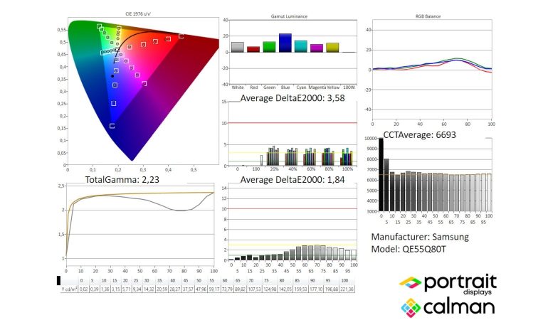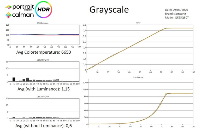 In de ‘Film’ beeldmode zijn de resultaten erg goed. Hou er rekening mee dat ‘Helderheid’ in de instellingen nu de nieuwe naam is voor wat vroeger ‘Achtergrondverlichting’ heette. Met die instelling op 23 is het beeld al helder genoeg, je kan het nog flink hoger halen als je kijkt bij veel omgevingslicht. De grijsschaal is neutraal, en neigt ten gevolge van de local dimming in de helderste tinten naar te helder, al stoort dat niet echt. De kleurweergave is prima, de iets hogere gemiddelde fout (net boven de zichtbare grens) is steevast te wijten aan iets te heldere weergave. De Samsung komt best tot zijn recht in gewone kijkomstandigheden met matig omgevingslicht maar doet het ook prima bij verduistering.