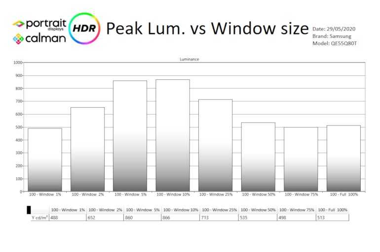 Het scherm pakt uit met een piekluminantie van ongeveer 866 nits, maar over lange periodes ligt ze eerder rond de 820 nits. Op een volledig wit scherm haalt de Q80T nog steeds een ruime 511 nits. Ze liggen iets lager dan wat we vorig jaar op de Q80R vonden (1070 / 560), maar dit blijft een zeer goed resultaat.