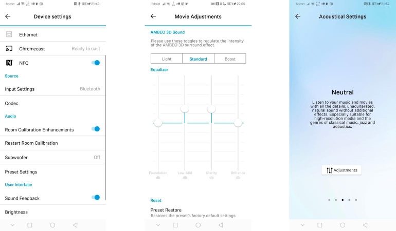 Na het inmeten van de kamer kun je aan de slag. Voor onze test sloten we een Xbox One X en een Samsung UBD-K8500 rechtstreeks op de Ambeo Soundbar aan, zodat we zeker bitstream-geluid konden aanleveren. Nog even dit: we spraken over Ambeo als de technologie die zorgt dat surroundgeluid in je kamer wordt weergegeven alsof er aparte speakers zijn geplaatst. Dat wil echter niet zeggen dat de Sennheiser-soundbar problemen heeft met bijvoorbeeld Dolby Atmos. In tegendeel, het toestel verwerkt nagenoeg elke relevant surroundcodec, inclusief Atmos en DTS:X. Lever je een soundtrack aan zonder hoogte-kanalen, bijvoorbeeld een film in Dolby TrueHD 7.1 of muziek in stereo, dan kun je ervoor kiezen om de Ambeo 3D-functie in of uit te schakelen. Ingeschakeld zal de soundbar het signaal opwaarderen naar 5.1.4. De Ambeo Soundbar is ook het eerste audiotoestel dat we ontmoeten dat MPEG-H ondersteunt, een Dolby Atmos-alternatief dat schijnbaar in Azië belangrijk begint te worden bij tv-uitzendingen.
