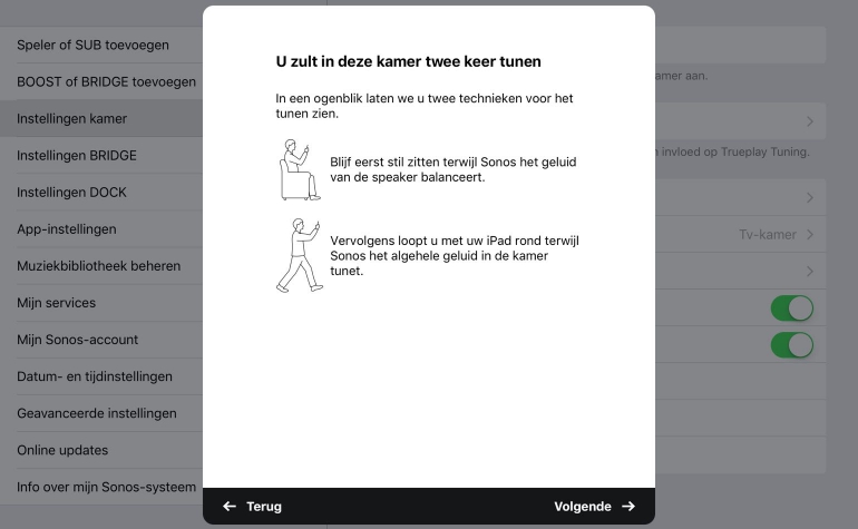 De Trueplay-meting is inmiddels wel iets uitgebreider dan in het begin. Nu worden er twee metingen gedaan: één in de kijk- en luisterpositie en één door de hele kamer heen. Bij die tweede meting moet je tijdens het afspelen van de testtonen al zwaaiend met je mobiele toestel door de kamer lopen. Het oog wat gek, maar is zo voorbij. Zwaai wel niet te snel, want dan mag je de test opnieuw uitvoeren.