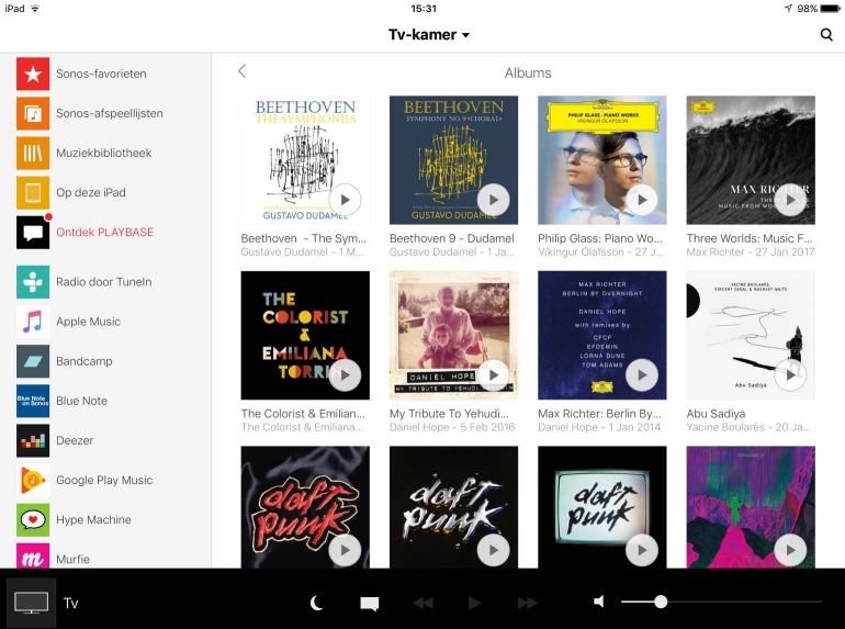De Playbase kun je puur gebruiken om het geluid van je tv te verbeteren, maar de speaker is eveneens in staat om muziek weer te geven uit een varia van bronnen. Ook dit is een punt waar Sonos een voorsprong heeft op rivalen. Het ondersteunt tientallen streamingdiensten, waaronder alle grote en de meeste kleine. We kunnen geen ontbrekende streamingdiensten bedenken. Daarnaast kun je ook eigen muziekbestanden afspelen (enkel lossy formaten zoals MP3, AAC en lossless tot cd-kwaliteit, geen hi-resaudio) en internetradio beluisteren. Het instellen van een muziekdienst is eenvoudig en in een minuut geregeld. Sonos betekent ook ‘multiroom’: via de app kun je de Playbase koppelen met andere Sonos-speakers, het geluid van je tv naar andere speakers sturen of gewoon toestaan dat ieder gezinslid in zijn eigen kamer naar zijn eigen muziek luistert. Dat koppelen en wisselen gaat bijzonder vlot allemaal.