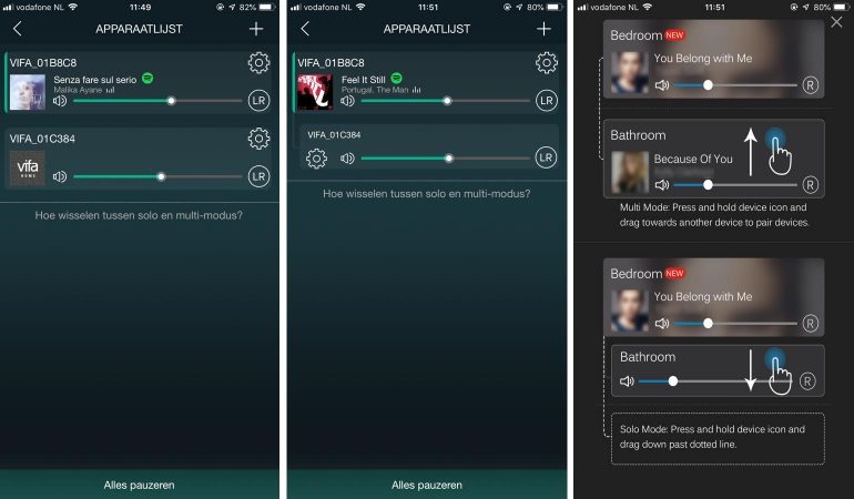 Vifa Link is de multiroom-functie van het Deense bedrijf. Deze kun je fysiek gebruiken, door de Link-knop aan de achterzijde van één van de speakers in te drukken en hem zo te koppelen aan andere speakers in huis. Dit werkt vrij snel; na een korte toon is de ene (niet-actieve) speaker met de andere actieve speaker gekoppeld. Vanuit de app kan het echter ook, op de Apparaatlijst-pagina. Hier houdt je één van de speakers ingedrukt en schuif je hem over de andere. Vervolgens worden ze binnen enkele seconden gekoppeld. Je kunt de speakers nog los van elkaar bereiken en bedienen. Ze zijn alleen gekoppeld voor de input.