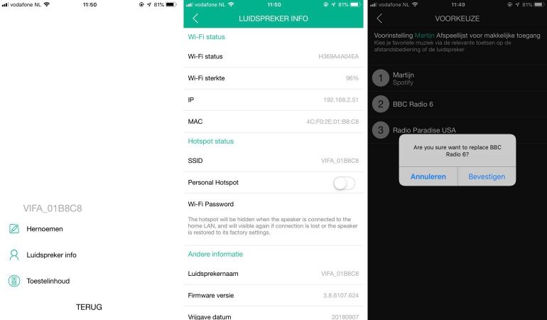 Zoals gezegd kun je direct aan de slag, zonder veel aanpassingen. Wat je via de home-app nog wel kunt regelen is de naamgeving van de speaker, wat wel zo eenvoudig is als je er meerdere hebt staan. Ook kun je elke speaker middels Vifa Play (zie hieronder) favorieten toewijzen die direct opgestart kunnen worden. Een equalizer of andere tools om de audioweergave aan te passen zijn helaas niet aanwezig; je moet het dus doen met de weergave vanuit de doos.