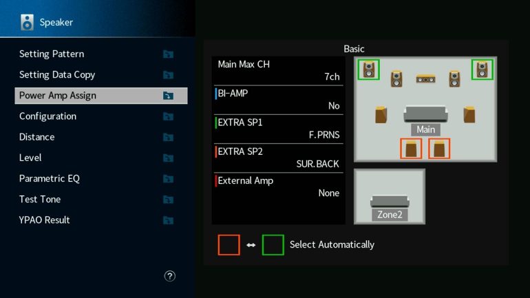 De tv-interface van de RX-A1080 ziet er prima uit op een Ultra HD-scherm (al blijven we natuurlijk pleiten voor een interface in een native 4K-resolutie). Wie zich wel comfortabel voelt bij de uitgebreide menu’s, ontdekt bij de Yamaha RX-A1080 ongezien veel opties om te tweaken en je surroundset optimaal in te stellen. Het is een heel andere ervaring dan bij pakweg de Onkyo TX-RZ830, waar er gekozen wordt voor een heel beperkte interface die helemaal to-the-point blijft. Bij een belangrijk onderdeel – het instellen van je luidsprekers – is de Yamaha-interface in elk geval wél heel duidelijk. Je moet wel rekening houden met soms wat ongewone terminologie. Dat komt omdat Yamaha een eigenzinnig merk is dat heel aparte zaken aanbiedt. Zo spreekt Yamaha bij de mogelijke luidsprekerconfiguraties over presence-speakers, als het gaat om luidsprekers in de hoogte. Dolby Atmos en DTS:X worden ondersteund, maar je kunt deze luidsprekers eveneens inzetten om DPS-effecten hoog in de kamer in te sturen. De RX-A1080 ondersteunt trouwens enkel hoogtespeakers vooraan, wel met de optie voor reflecterende Dolby-speakers, muurspeakers of inbouw in het plafond. De aanwezigheid van die keuzes is een echte plus, want die drie speakertypes gedragen zich allemaal anders.
