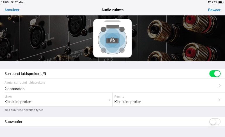 Voor een surroundopstelling met draadloze onderdelen moet je werken met MusicCast-speakers (de MusicCast 20 of 50, andere modellen werken niet) en eventueel MusicCast Sub 100. Voor onze test gingen we aan de slag met twee MusicCast 20-speakers. Ze koppelen aan de receiver gaat betrekkelijk vlug. Eerst moet je de receiver en eventueel de speakers koppelen met de MusicCast-app, wat telkens neerkomt op een Connect-knopje vijf seconden ingedrukt houden. Als je de toestellen met ethernetkabels verbindt met je netwerk, dan komt het heel snel in orde, kies je voor WiFi (wat logisch is voor de rear-kanalen) dan moet je een kort stappenplan uitvoeren. Je voegt de receiver en de speakers daarna aan een kamer toe en geeft ze een eigen plaatje. Daarna duik je in de instellingen van de app en creëer je een Surround-setup door de twee speakers te slepen op de receiver. Heel moeilijk is het niet. Maar, zoals we merkten bij het instellen, je moet op de receiver in de setup ook een 5.1-opstelling instellen. Dat is logisch, maar omdat de interface van de RX-A1080 gericht is op bekabelde luidsprekers en draadloze speakers niet vermeldt, kun je nog twijfelen. Je vraag je misschien ook af of je bijvoorbeeld twee MusicCast-speakers kunt inzetten om je 5.1-opstelling naar 7.2 te brengen? Dat zou mooi zijn geweest, maar helaas… 5.1 is momenteel de enige mogelijke opstelling.