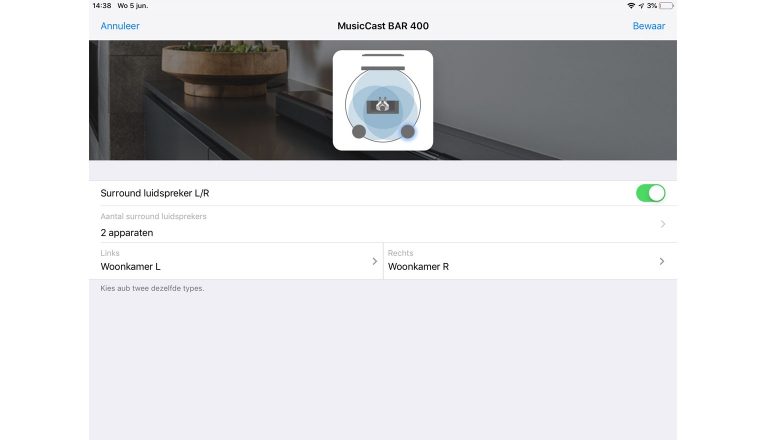 Een pluspunt bij de Bar 400 is de MusicCast Surround-optie. Je verbindt dan draadloos twee gelijke MusicCast-speakers (de 20 of 50) met de soundbar. Het tweetal zet je naast of achter de sofa in de woonkamer. Het kan ook met een enkele MusicCast 20 of 50, maar dat lijkt ons minder optimaal dan twee speakers. MusicCast Surround is overigens iets anders dan het linken van meerdere MusicCast-speakers in één groep. Dat kan ook, en doe je vanuit het hoofdscherm van de app, via de optie ‘link’. Je kunt dan het geluid van de soundbar (bijvoorbeeld afkomstig van je tv) doorsturen naar MusicCast-speakers of -toestellen in andere kamers. Dat is handig als je de commentaar bij een voetbalmatch wil volgen terwijl je even iets neemt in de keuken. Bij MusicCast Surround wordt het filmgeluid verdeeld over de soundbar en de twee speakers in dezelfde kamer. Klanken die in de filmsoundtrack vooraan in het surroundveld zit (zoals dialogen) komen uit de Bar 400, geluiden achteraan in de soundtrack (zoals geweerschoten in de verte) komen van achter je. Bewegende geluidseffecten worden door het gebruik van de bijkomende speakers ook dynamischer van aard. Je hoort de beweging veel meer dan met de soundbar alleen.