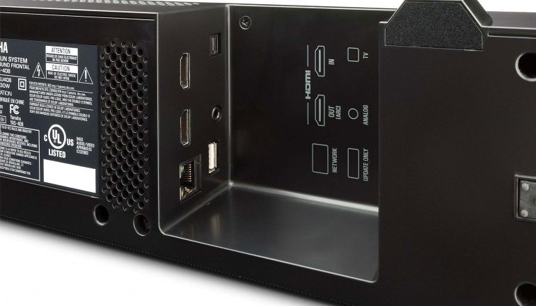 De MusicCast Bar 400 is geen grote soundbar. De afmetingen van 98 x 6 x 11 cm zijn bescheiden, waardoor deze gitzwarte soundbar relatief subtiel op een tv-meubel prijkt. Als rasechte Japanners hebben de ontwerpers van Yamaha gekozen voor een ingetogen, degelijk afgewerkt minimalistisch ontwerp. Het gaat vast geen designprijzen winnen, maar komt zeker niet goedkoop over. De strakke vormgeving wordt geholpen door de slimme plaatsing van alle poorten. De aansluitingen zijn gebundeld in twee nissen aan de achterzijde van de soundbar. Wie een beetje handig is, kan dus slim aan kabelmanagement doen en alle snoeren naar de soundbar discreet wegwerken.