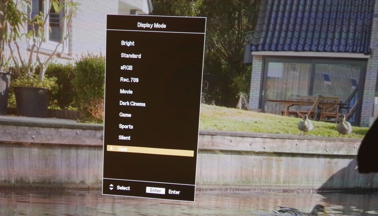 De menu’s bieden alle noodzakelijk instellingen, maar staan in het midden van het beeld. Er is ook geen optie om ze te verplaatsen, en dat kan bij het kalibreren best lastig zijn. Er is een lange rij presets beschikbaar zoals Movie, Dark Cinema en een sRGB- en Rec709-mode. Een minpunt: je kunt de beeldpresets niet aanpassen. Dat betekent onder andere dat je de ‘silent’-mode niet kan tunen naar eigen smaak.