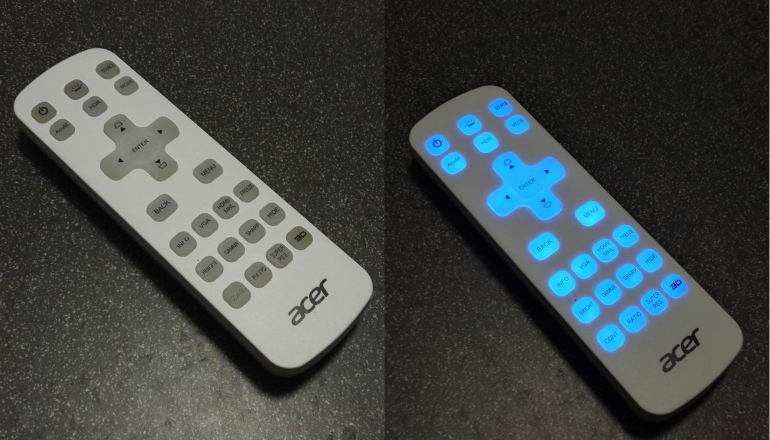De kleine remote is voorzien van verlichting, altijd handig voor een projector. Daarnaast beschikt hij over een ruime selectie toetsen waarmee je rechtstreeks toegang krijgt tot bepaalde beeldaanpassingen.
