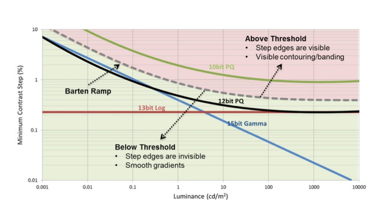 Dolby labs creëerde daarom een nieuwe EOTF die de Barten-ramp nauwkeurig volgt en die tot 10.000 nits gaat. Die kreeg de naam PQ (Perceptual Quantizer). Met 12 bits kan de PQ-curve het volledige signaalbereik foutloos weergeven. In de praktijk is een 12 bit signaal enkel absoluut vereist voor animatie en graphics, omdat deze beelden geen enkele ruis bevatten. Bij reguliere camerabeelden waar in steeds wat ruis zit volstaat een 10 bit versie.