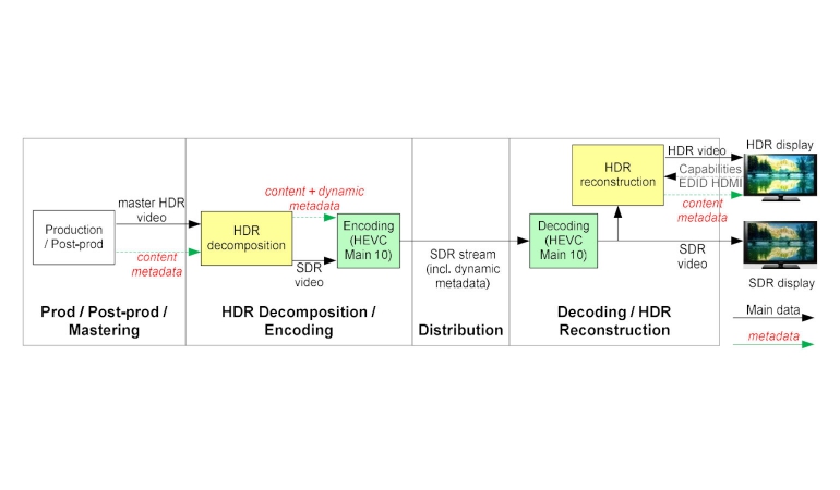 Technicolor en Philips hebben beide ook een apart voorstel voor high dynamic range, maar bundelden hun krachten. Het resultaat is SL-HDR1. De standaard heeft als groot voordeel dat hij werkt met een enkele laag (vandaar: Single Layer, SL) die zowel op bestaande SDR-tv’s als nieuwe HDR-tv’s getoond kan worden. De basislaag is een klassieke SDR-compatibele videostroom (8 of 10-bit bitdiepte) en ze wordt vergezeld van metadata. SDR-tv’s negeren die metadata en tonen het oorspronkelijke SDR-beeld. HDR-tv’s gebruiken de metadata om in een post-processing stap de HDR-versie te creëren. SL-HDR1 claimt in beide gevallen de oorspronkelijke kwaliteit te behouden. Het SDR-beeld is perfect te vergelijken met de huidige content, en de HDR-versie boet niet in aan kwaliteit vergeleken bij bijvoorbeeld een HDR10 versie. De statische én dynamische metadata laten bovendien toe om het beeld aan te passen aan de capaciteiten van het scherm.