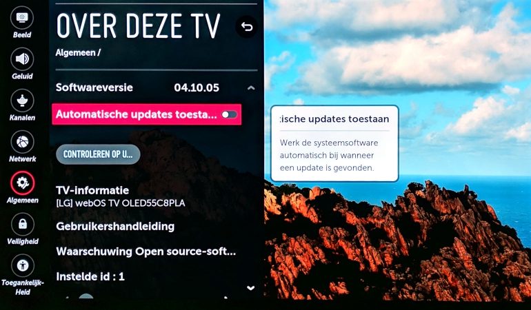 - ‘Over deze tv’: Open dit submenu om eventuele software updates uit te voeren.