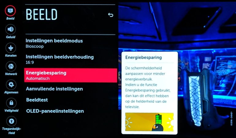 - ‘Energiebesparing’: Selecteert ‘automatisch’ als je de lichtsensor wenst te gebruiken. De helderheid van het beeld wordt dan aangepast op basis van het omgevingslicht in de kamer.