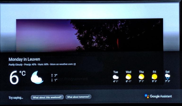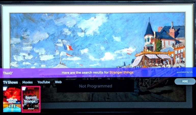 LG maakt voor een deel van zijn diensten gebruik van de Google Assistant. Die kan je bijvoorbeeld vragen welk weer het is (What’s the weather today), of om conversies voor je te doen (Convert 15 kg to Stone), Hoeveel afleveringen er zijn in Game of Thrones (How many episodes in Game of Thrones) en nog veel meer. Indien je de Google Assistant configureert met je Google-account kan je ook informatie vragen over je kalender (what’s on my calendar today), of kan je je foto’s bekijken die in Google Photo’s zitten (Show my photo’s). Een zoektocht naar ‘Stranger Things’ bracht ons rechtsreeks naar de reeks op Netflix.