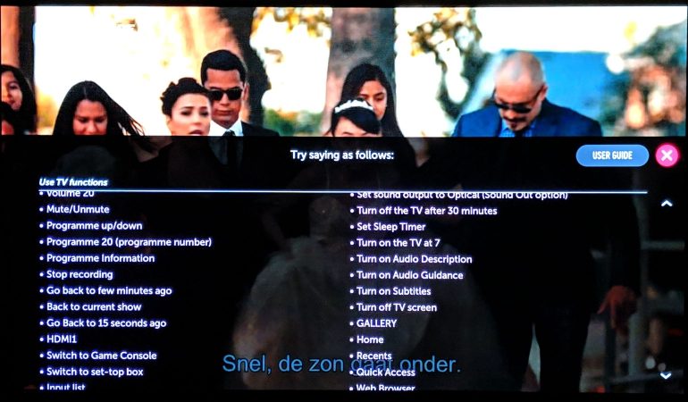 Het eerste commando dat je best even inspreekt is ‘Help’. De televisie toont dan een ruim overzicht van de mogelijkheden. Zo kan je van ingang veranderen, het volume of kanaal aanpassen, maar je kunt ook de beeldmode en geluidsmode aanpassen. Of de tv uit schakelen na het huidige programma. Er zijn enorm veel mogelijkheden, al werken die voorlopig nog niet allemaal (bijvoorbeeld als ze gebruik maken van de programmagids, omdat die met de bovenstaande instellingen een Engelse programmagids verwacht).