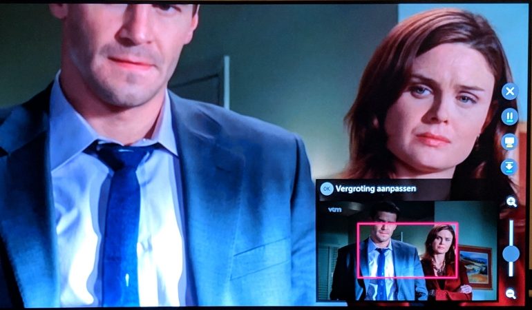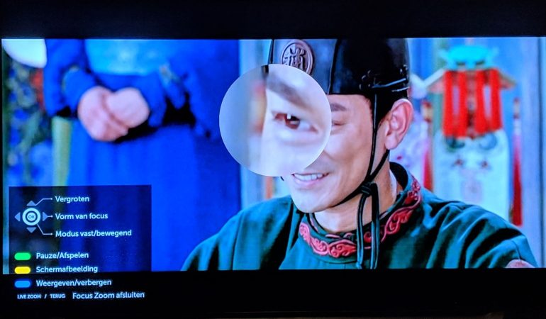 Druk op de Live Zoom toets rechts onderaan op de remote om in te zoomen op het beeld. Je kunt dan van 100% tot 200% inzoomen op een deel van het beeld dat je zelf bepaalt (door het kader te verslepen). Drie toetsen aan rechterzijde laten je toe om het beeld te pauzeren (groen), een screenshot te maken (geel) of de interface tijdelijk te verbergen. Screenshots kan je bekijken in de ‘Foto en Video’ app van de tv.