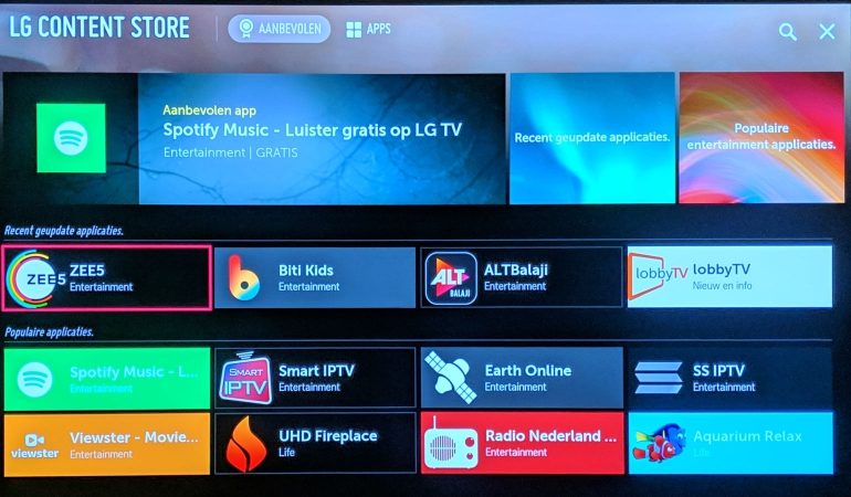 In de LG content-store vind je een uitgebreid aanbod toepassingen. Bovenaan kan je kiezen om LG ’s aanbevelingen te zien (‘Aanbevolen’) of om eenvoudig door alle apps te bladeren (‘Apps’).