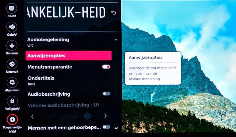 - ‘Aanwijzeropties’: Hier pas je de snelheid van de Magic remote cursor aan. Je kan ook voor een grotere of kleinere cursor-afbeelding kiezen.