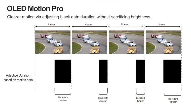 Zo zou de wijziging in helderheid minder zichtbaar zijn, terwijl je toch verbeterde bewegingsscherpte hebt. OLED Motion Pro zal instelbaar zijn in vier modes: laag (waarbij het beeld voor 30% van de tijd vervangen is door een zwart frame), medium (waarbij het zwart frame 50% van de tijd zichtbaar is), Hoog (waarbij de medium stand aangevuld wordt met klassieke Black Frame Insertion en je dus ook het aantal frames per seconde verdubbelt) en Auto waarbij de tv op basis van de content beslist.