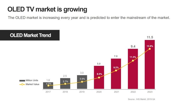 Welke trends ziet LG op de markt? Geïllustreerd met cijfers van IHS Markit zien we een duidelijk groeiende trend in het marktaandeel van OLED. Waar OLED vorig jaar 5,9 % van de marktwaarde betekende, zou dat in 2020 groeien naar 8% en tegen 2023 14%. Die cijfers zijn weliswaar voor de wereldmarkt. In de Benelux mogen we veilig veronderstellen dat die cijfers beduidend hoger liggen, vermits in onze markt meer premium toestellen verkocht worden.
