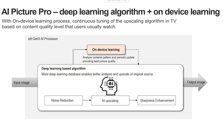 LG geeft daarbij ook aan dat de televisie in staat is om continu zelfstandig bij te leren en het upscaling algoritme te verbeteren. Hoe dat expliciet werkt, moet LG ons nog verklaren. Bij typische Machine Learning leert het algoritme immers door paren van het originele beeld te vergelijken met downscaled versies. Zo leert het hoe het upscalen moet gebeuren om zo dicht mogelijk bij het origineel te komen. Maar voor dit ‘On-device learning’ krijgt de tv enkel de aangeleverde lage resolutie beelden die we bekijken. Het hoge resolutie origineel kennen we niet. Hoe de tv daaruit leert, hopen we nog te weten te komen.