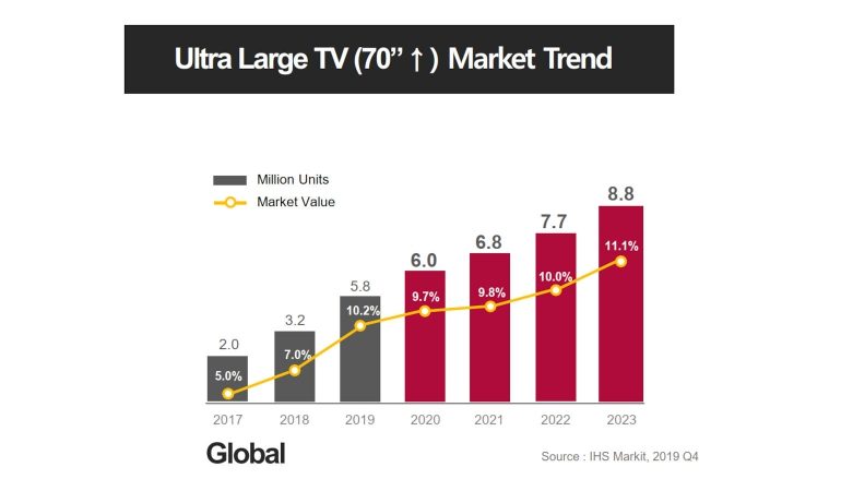 Televisies worden ook steeds groter, maar de cijfers van Ultra Large schermen (70” en groter) tonen daar eerder een groei in de rest van de wereld en niet zo zeer in Europa. Daar zouden deze schermen in 2020 5,3% van de marktwaarde vertegenwoordigen en tegen 2023 nog steeds maar 6,3%. Ook de absolute aantallen tv’s stijgt in deze categorie in Europa slechts traag. Vooral Noord Amerika lijkt erg van de grote maten te houden.