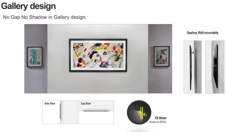 Tussen die twee komt nu een enkel extra model, het Gallery Design (GX)-model. Dat is een zeer slanke uitvoering, 19,9mm dik, maar ze bevat wel alle aansluitingen en luidsprekers. Dit model kan bovendien perfect aansluitend tegen de muur gemonteerd worden. Wie het geluid toch nog wil uitbreiden kan kiezen voor een optionele soundbar.