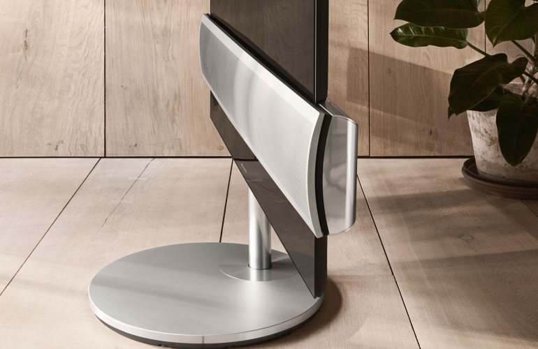 Het smalle glazen oppervlak van de oled tv loopt door onder het SoundCenter, dat op zijn beurt aan weerskanten van het scherm verdergaat. Je kunt daarbij een persoonlijke stempel op het ontwerp drukken, aangezien je de voorkant van de luidspreker naar eigen keuze vorm kunt geven door te kiezen voor ofwel aluminium of gekleurde stoffen. De gemotoriseerde vloerstand maakt de BeoVision Eclipse flexibel in het gebruik. Met een druk op de knop kun je de tv over de vloer verplaatsen. Naast de vloerstand kan de televisie ook worden geplaatst op een gemotoriseerde of handmatige muurbeugel.