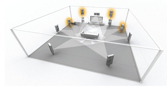 Er is echter nog een andere opstellingsmogelijkheid wanneer je een 7.1-kanaals receiver hebt. Je kunt in plaats van de twee speakers aan de achterzijde twee speakers aan de voorzijde toevoegen, ook wel height of wide speakers genoemd. Dolby Pro Logic IIz en Audyssey DSX zijn twee formaten/instellingen die deze opstelling mogelijk maken. Deze instellingen, terug te vinden op receivers en niet op bronnen zoals DVD’s en Blu-Ray discs, zorgen dat de receiver extra surround informatie stuurt naar de twee luidsprekers die geplaatst zijn boven de twee front luidsprekers De weergave van het geluid komt zo nog dichter bij de realiteit.