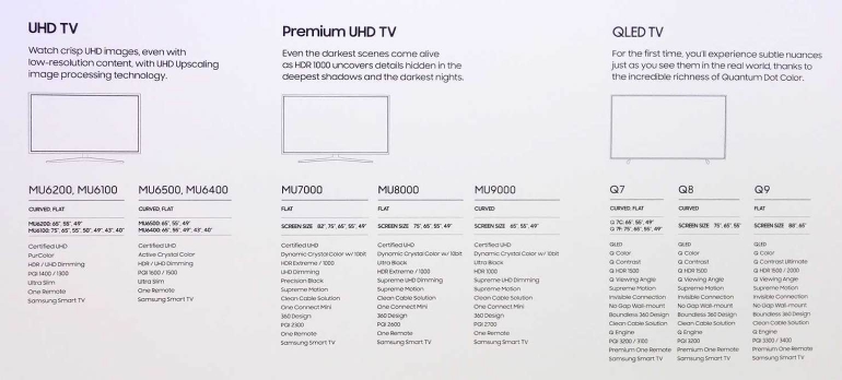 Alle nieuwe tv’s voor 2017 worden voorzien van ondersteuning voor HDR HLG (Hybrid Log Gamma) en krijgen een vernieuwde versie van het Tizen smart tv-platform. De MU-modellen, wat eigenlijk de overige tv’s zijn, moeten het doen zonder het nieuwe quantum dot-materiaal. Ook in deze series brengt Samsung zowel gebogen als platte varianten op de markt. De helderheid van HDR-materiaal ligt op maximaal 1000 nits.