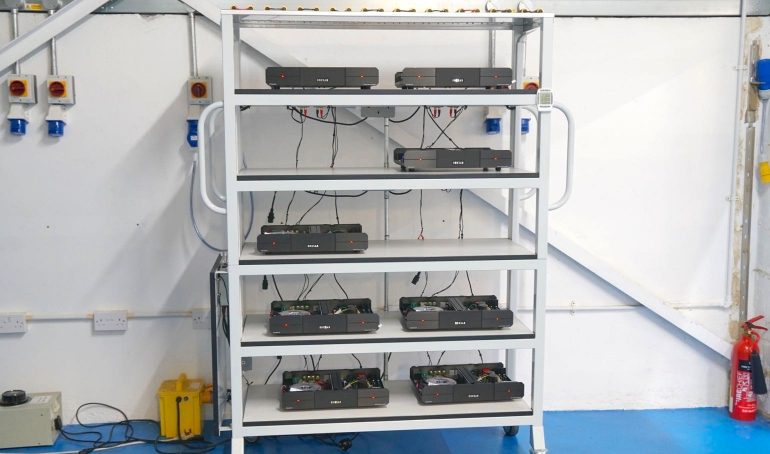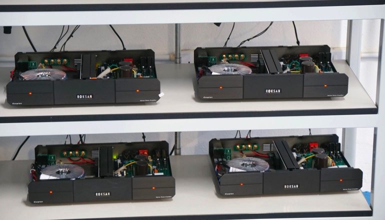 Als we een toer maken door het gebouw, blijkt niet alles bureaus en een gigantisch magazijn te zijn. De productie van Roksan is nog maar recent naar Rayleigh verhuisd, zowel van de versterkers als van de draaitafels. Het is relatief rustig als we langskomen; zoals wel vaker worden persbezoeken georganiseerd op een kalmer moment. Een heel aantal Roksan Caspian-versterkers staan aangesloten in een rack, als deel van de testprocedure die elk toestel ondergaat. Tussen de immense stapels van luidsprekerdozen is er nog een anechoïsche kamer verstopt. Het wordt gebruikt voor metingen van luidsprekerconcepten. Enorm groot is het niet, maar: “Het volstaat voor de meeste speakers. Toen we het bouwden was de kamer het neusje van de zalm, maar nu zijn we weer intern aan het spreken over de bouw van een nieuwe”.