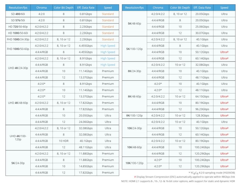 Bij de aankondiging van HDMI 2.1 werd vooral de nadruk gelegd op de hogere bandbreedte van de nieuwe versie. Die stijgt van 18 Gbps (HDMI2.0) naar 48 Gbps (HDMI2.1). Die hogere bandbreedtes zijn noodzakelijk voor toekomstige resoluties (8K en hoger) en framerates (100fps en hoger). In de onderstaande figuur zie je welke resoluties mogelijk worden met HDMI 2.1. Elke resolutie/fps combo waar je in de ‘Speed’ kolom standard, High Speed, of Premium aantreft, kan nog met HDMI 2.0. Staat er in de ‘Speed’ kolom Ultra, dan betekent dat dat je een HDMI 2.1 aansluiting nodig hebt. Full HD/120 fps staat niet in de tabel, maar dat kan je ook nog realiseren met HDMI 2.0. Maar voor 4K/120fps heb je dus HDMI 2.1 nodig.