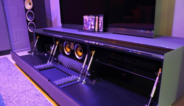 In de volgende stap kun je de inrichting van de ruimte gaan verwezenlijken. Denk aan welke meubels je nodig hebt maar ook hoe je bijvoorbeeld de vloer van een kleed of tapijt (beter voor de akoestiek) gaat voorzien. Vergeet ook niet een meubel voor wanneer je de apparatuur onder je scherm kwijt wilt en natuurlijk een meubel voor je filmcollectie. Wellicht het belangrijkste meubel is het zitmeubel op de luisterpositie.
