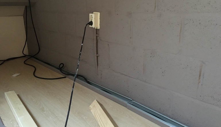 De volgende stap in het opbouwen van de ruimte, in de basis, was het leggen van de benodigde kabels voor lichten. Het plan is om tegenover de deur (binnenkomst) twee lampen te plaatsen, net als naast de deur. Deze lampen worden middels één dimmer naast de deur bediend (we gaan overigens hiervoor Hue-lampen gebruiken zodat ze ook met de smartphone te bedienen zijn) en kunnen na overleg met Mutrox in akoestische panelen verwerkt worden. We leggen de kabels hiervoor nu ruim genoeg om later nog te kunnen schuiven. Wel verwerken we opvallende stukken reeds in kabelgoten, welke we naderhand dezelfde kleur als de wand geven.