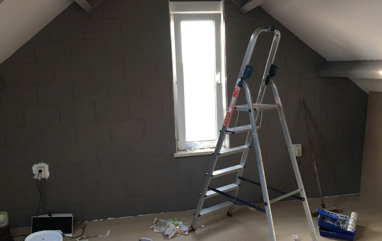 Het eerste dat we gedaan hebben is de ruimte compleet strippen. Alleen de laminaatvloer (al een hele oude maar prima voor nu) hebben we laten liggen. Vervolgens hebben we de hele ruimte schoongemaakt en zijn we begonnen met het schilderwerk. We hebben gekozen voor een donkere (grijze) kleur voor de grootste wanden en houten balken. De mdf-platen in het plafond hebben we voorzien van een aardtint (veen). Na twee lange dagen zag de ruimte er ineens een stuk frisser uit.