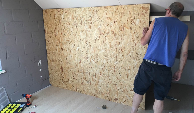 Elke ruimte heeft zijn nadelen en er zijn altijd wat andere belangen die meespelen. Aangezien wij voor de zolder gekozen hebben als home cinema-ruimte raakten we heel wat opslagruimte kwijt. Maar, we hadden een rechte wand nodig voor ‘het podium’ en daarachter zou een grote opslagruimte kunnen verschijnen. Mutrox had deze ruimte graag (grotendeels) gebruikt voor de akoestische optimalisatie (lage tonen) maar toch hebben we besloten de ruimte voor opslag te gebruiken. Als compromis moest de wand steviger en dikker zijn dan gepland. Hiervoor hebben we een houten frame gebruikt, waarop osb-platen van 18mm dik geplaatst zijn. Mutrox zet hier in een volgende stap akoestisch materiaal tegenaan, waarna wij er weer gipsplaten op bevestigen. Om in de ruimte achter de wand te komen was echter ook een deur vereist en na meedenken besloot Mutrox hiervoor een deur van akoestisch materiaal te ontwerpen. Na een middagje hard werken stond de basis van de wand, klaar voor akoestische optimalisatie. Vergeet overigens niet in dit stadium al de benodigde gaten te boren en uitsparingen te maken voor bekabeling en stroom.