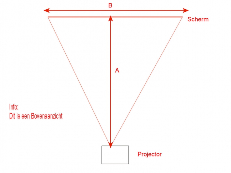De grootte van het geprojecteerde beeld hangt af van de afstand tussen de voorzijde van de projectorlens en het scherm. Deze eigenschap van de lens noemen we de projectieverhouding (in het Engels: throw-ratio). De projectieverhouding is de verhouding van de afstand tussen lens en scherm en de breedte van het beeld, in het figuur is dit (A/B).