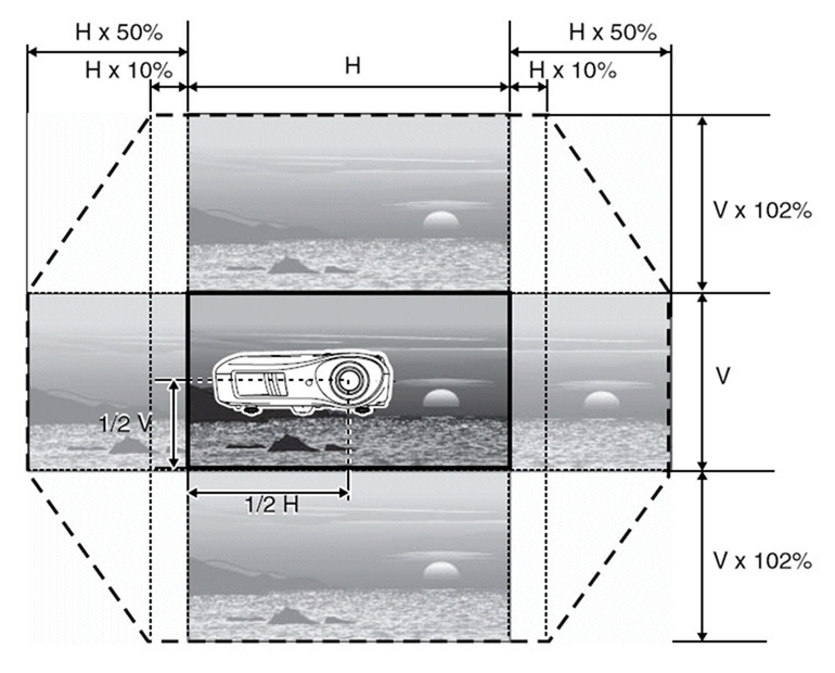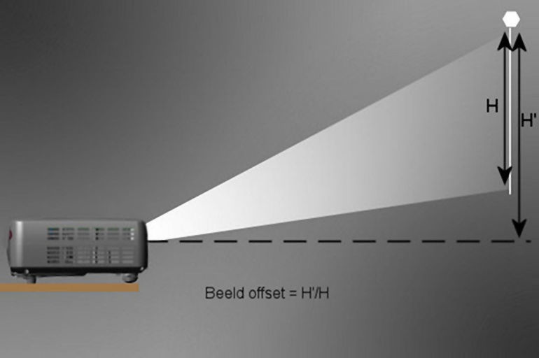 Een projector staat, horizontaal, steeds in het midden van het beeld. Maar verticaal is dat niet het geval. De lens-offset bepaalt hoe hoog de bovenzijde van het beeld zich boven de lens bevindt. Lensoffset is een bijzonder lastige specificatie omdat niet elke fabrikant ze op dezelfde wijze aanduidt. Een veel gebruikte manier is als volgt: lens-offset = afstand tussen bovenzijde van het scherm tot aan de lens gedeeld door de schermhoogte (in de figuur: H’/H)