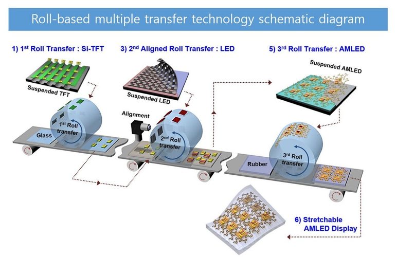 Een voorbeeld: het Korea Institute of Machinery & Materials (KIMM) heeft hiervoor rolproces ontwikkeld. In een eerste stap wordt de tft-laag op een tijdelijke glasplaat gerold, vervolgens worden de microLEDs opgepikt en op de tft-laag gerold. Tot slot kan de resulterende AMOLED-laag (active matrix LED) van het tijdelijk glas naar een rubber onderlaag gebracht worden. Zo maak je een rekbaar en plooibaar scherm.