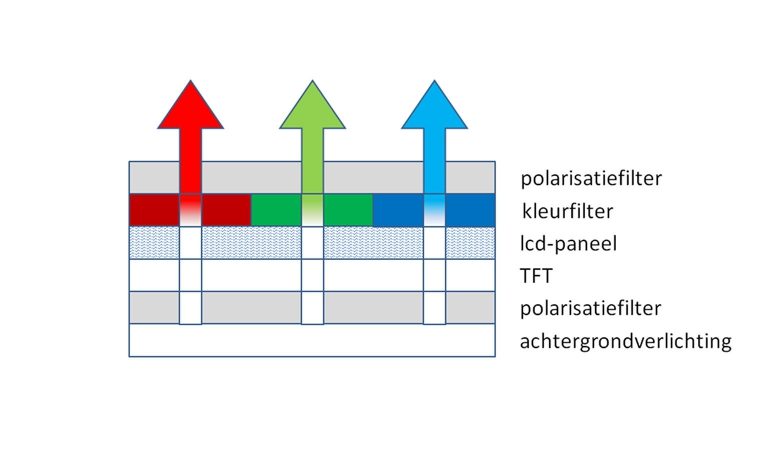 Heel kleine LEDs, hoe maak je daar een scherm mee? Elke pixel op een beeldscherm bevat een rode, groene en blauwe subpixel. Eerst bekijken we ter vergelijking nog even de structuur van een lcd-scherm. Daar zorgt een achtergrondverlichting voor het licht, en de en door tft (thin film transistors) aangestuurde lcd-laag zorgt samen met de polarisatoren voor individuele pixels.