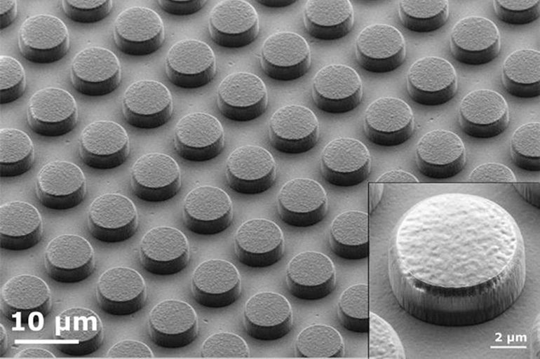 Een array van 25 microLEDs, naast de punt van een naald. (InfiniLed)