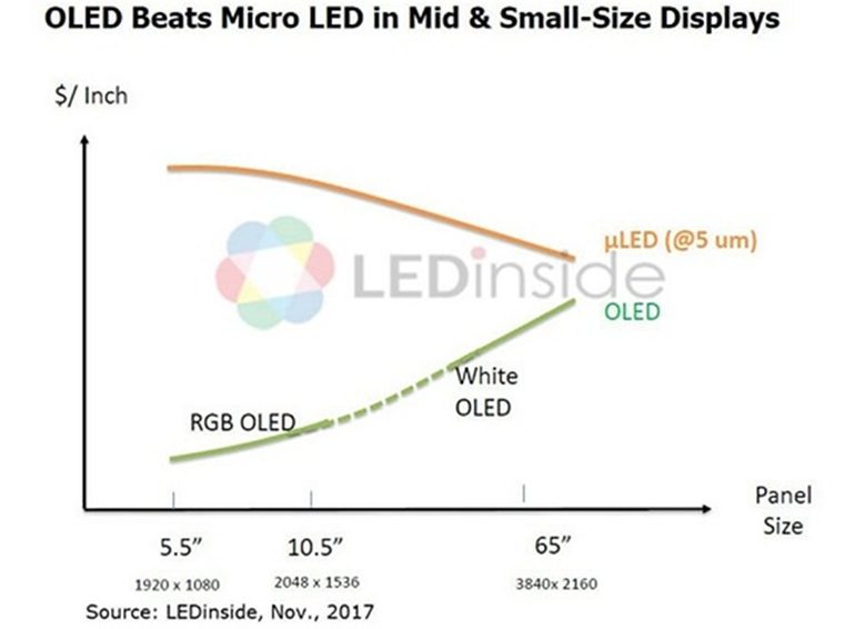 Bij erg kleine displays zou microLED wel een interessante optie kunnen zijn. Dan denken we aan smartwatches (Apple heeft bijvoorbeeld LuxVue overgenomen), maar ook de schermen in een VR-bril (Oculus is bezig in dit segment, via de overname van InfiniLED), of kleine HUDs in de autosector. Voor smartphone en televisie zou de prijs de keuze voor microLED voorlopig uitsluiten, zoals je kan zien op deze grafiek van LEDInside.