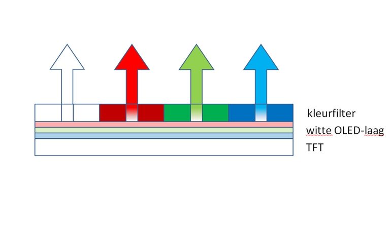 Die structuur lijkt erg op die van OLED overigens. RGB-OLED-schermen (zoals die in een smartphone) zijn op dezelfde manier opgebouwd. Die van de huidige OLED-televisies is licht anders, we geven ze voor de volledigheid ook nog eens mee. In plaats van rode, groene en blauwe subpixels, gebruiken ze allemaal witte subpixels, die gecombineerd worden met een kleurfilter. Bovendien gebruiken deze OLED-schermen ook een witte subpixel (daarom noemen we zo ook WOLED).