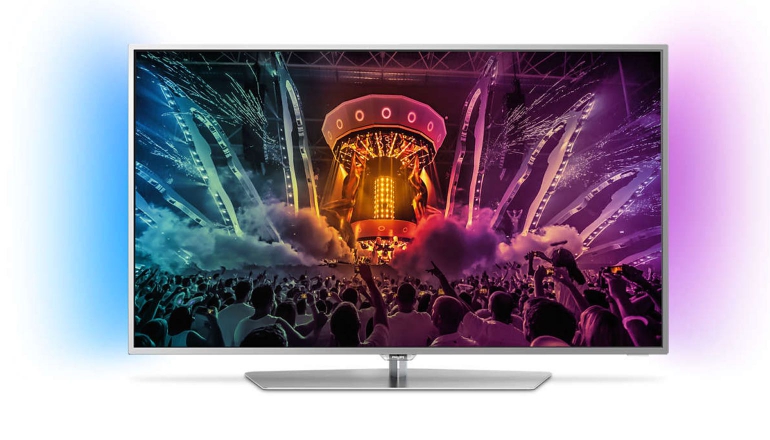 De ultradunne rand zorgt ervoor dat de Ambilight-projectie naadloos aansluit op het 4K Ultra HD-beeld. De tv is verder voorzien van een slank frame en vlakke draadvoet, vervaardigd uit hoogwaardige materialen.
