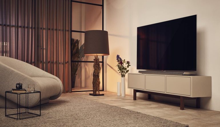 De Philips OLED973 is het topmodel in de line-up en dat dit het topmodel is zien we met name aan het design en de audiomogelijkheden. Deze 65-inch oled tv komt namelijk met een voet die ook dienst doet als soundbar. De soundbar is een 6.1-kanaals systeem met een vermogen van 60 Watt. Het systeem bestaat uit zes naar voren gerichte drivers en een naar achter gerichte Triple Ring speaker – met geïntegreerde basspeaker. De speaker is voorzien van een gestoffeerde voorzijde en achterop bevinden zich alle aansluitingen van de tv. De soundbar is dus niet afneembaar, maar kan wel gekanteld worden mocht je de tv aan de muur willen hangen.