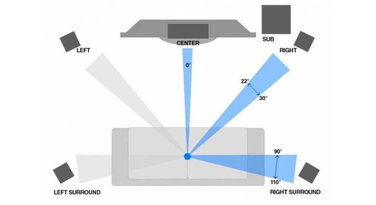 Wanneer je op de bank zit, op de positie waar vandaan je een film kijkt of muziek luistert, moeten de luidsprekers in een hoek van ongeveer 30 graden staan, aan weerszijden van het midden (vaak de tv). Ook is het belangrijk dat de luidsprekers naar binnen toe wijzen, in een rechte lijn richting de luisterpositie. De afstand tussen de luidsprekers en de tv moet ongeveer een meter zijn en beide luidsprekers moeten op dezelfde afstand van de tv en op dezelfde afstand van de luisterpositie staan. De subwoofer kun je in principe overal plaatsen aangezien deze een vaak omnidirectioneel geluid heeft maar de beste positie is links of rechts naast de tv. Plaats de subwoofer in ieder geval niet in een nis, hoek of afgesloten ruimte. Hiermee voorkom je de opbouw van geluid, wat de lage tonen overdreven en rommelig kan laten overkomen.